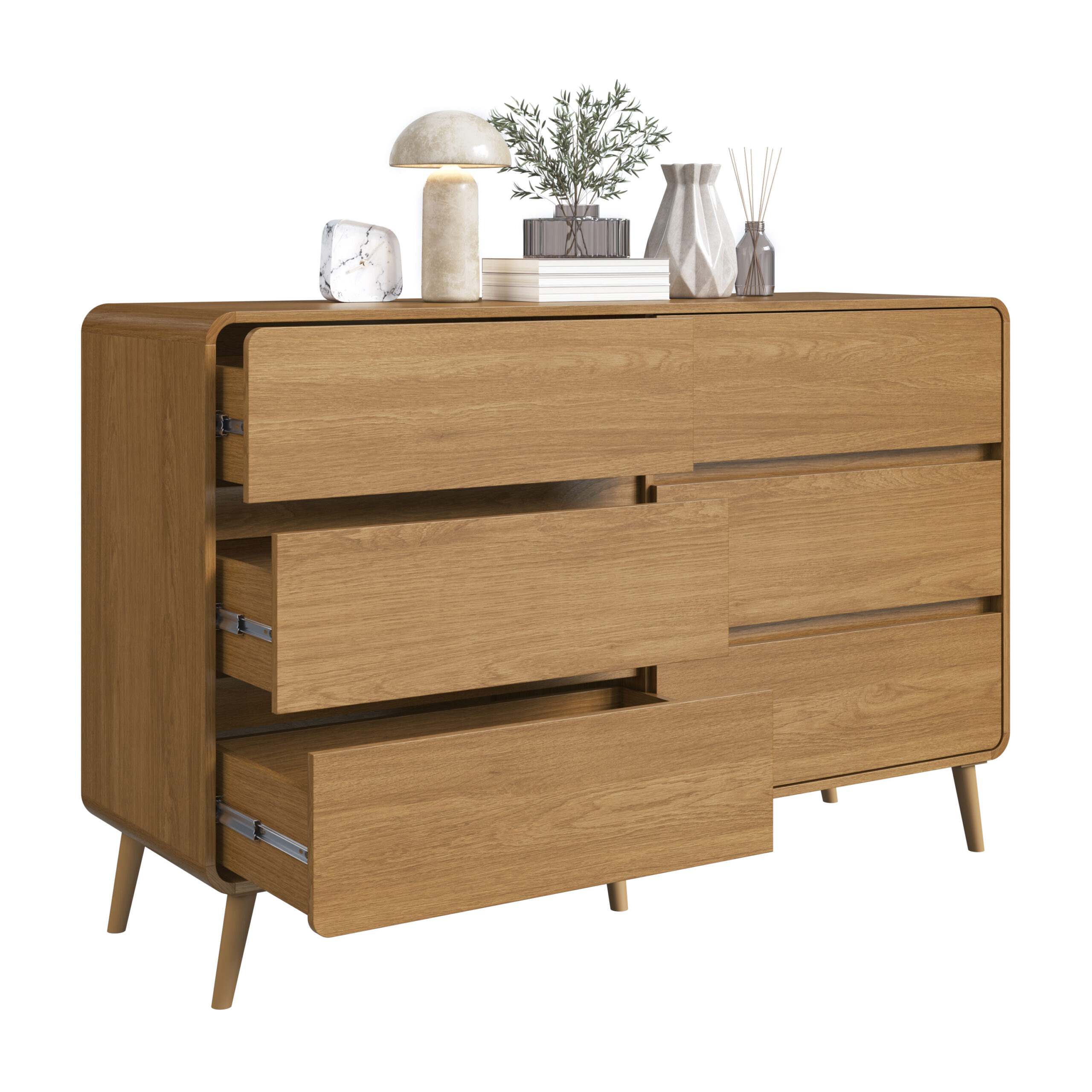 Equipada con seis amplios cajones, esta cajonera ofrece un excelente espacio de guardado. Cada cajón cuenta con guías telescópicas, permitiendo una apertura suave, silenciosa y de extensión total para un uso cómodo y práctico. Además, cada uno soporta hasta 4 kg, garantizando resistencia y durabilidad.