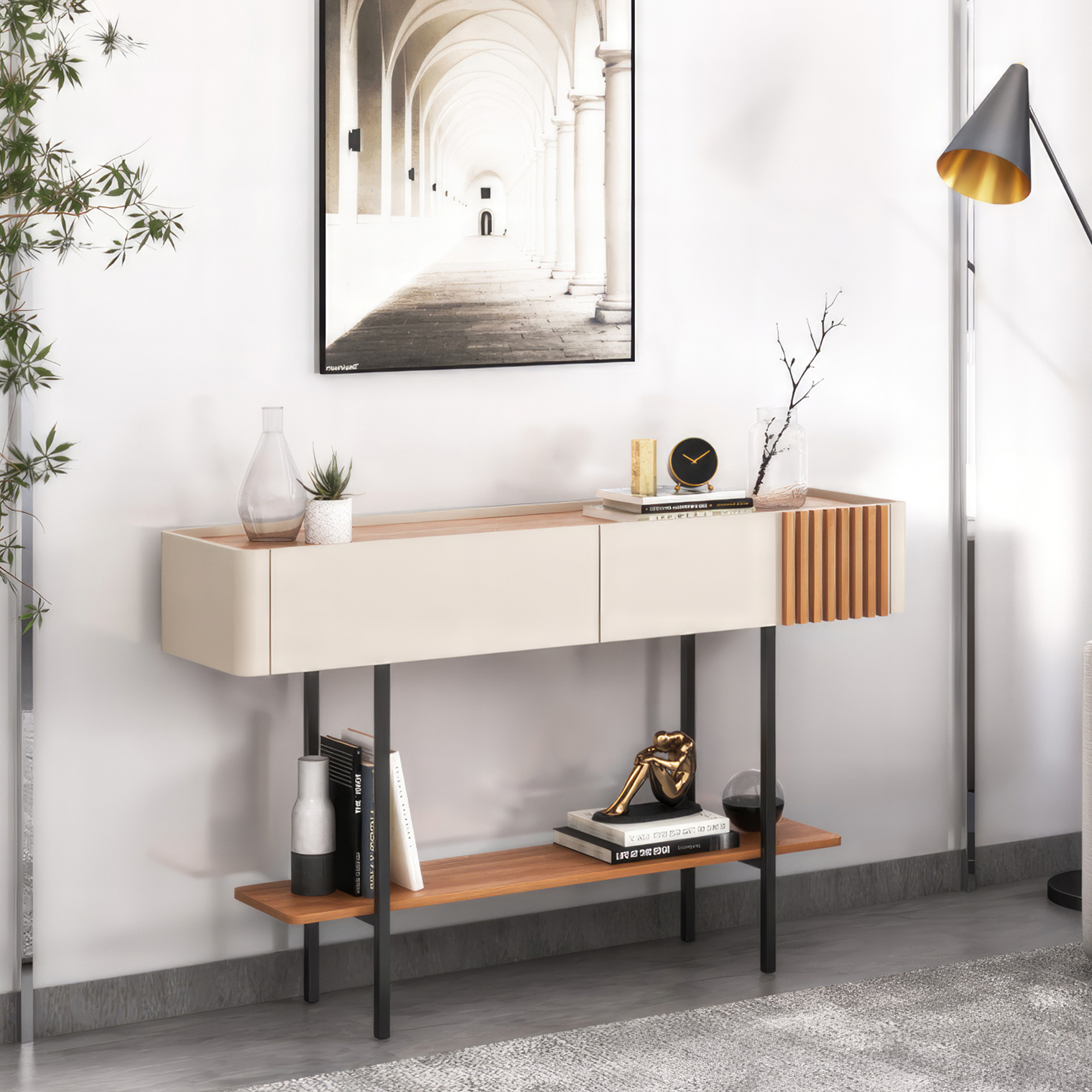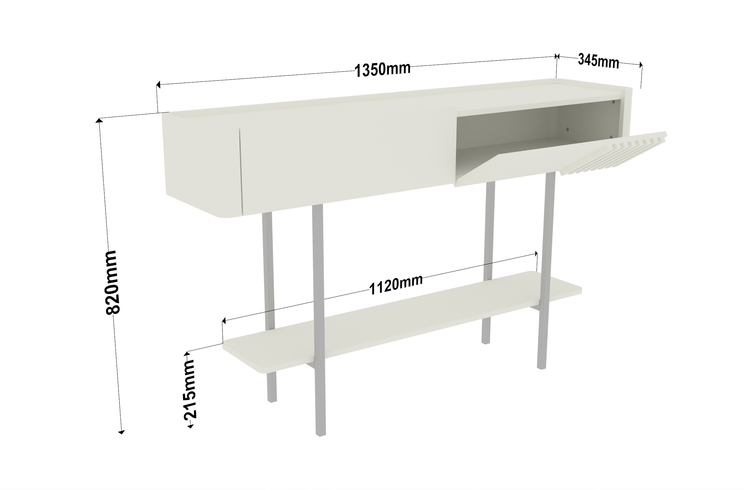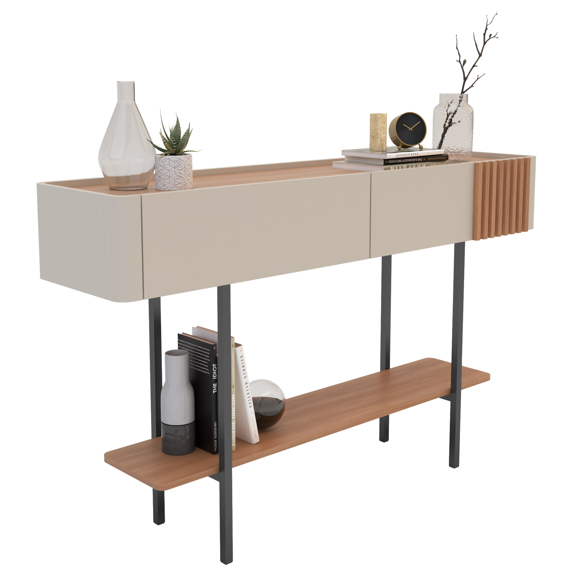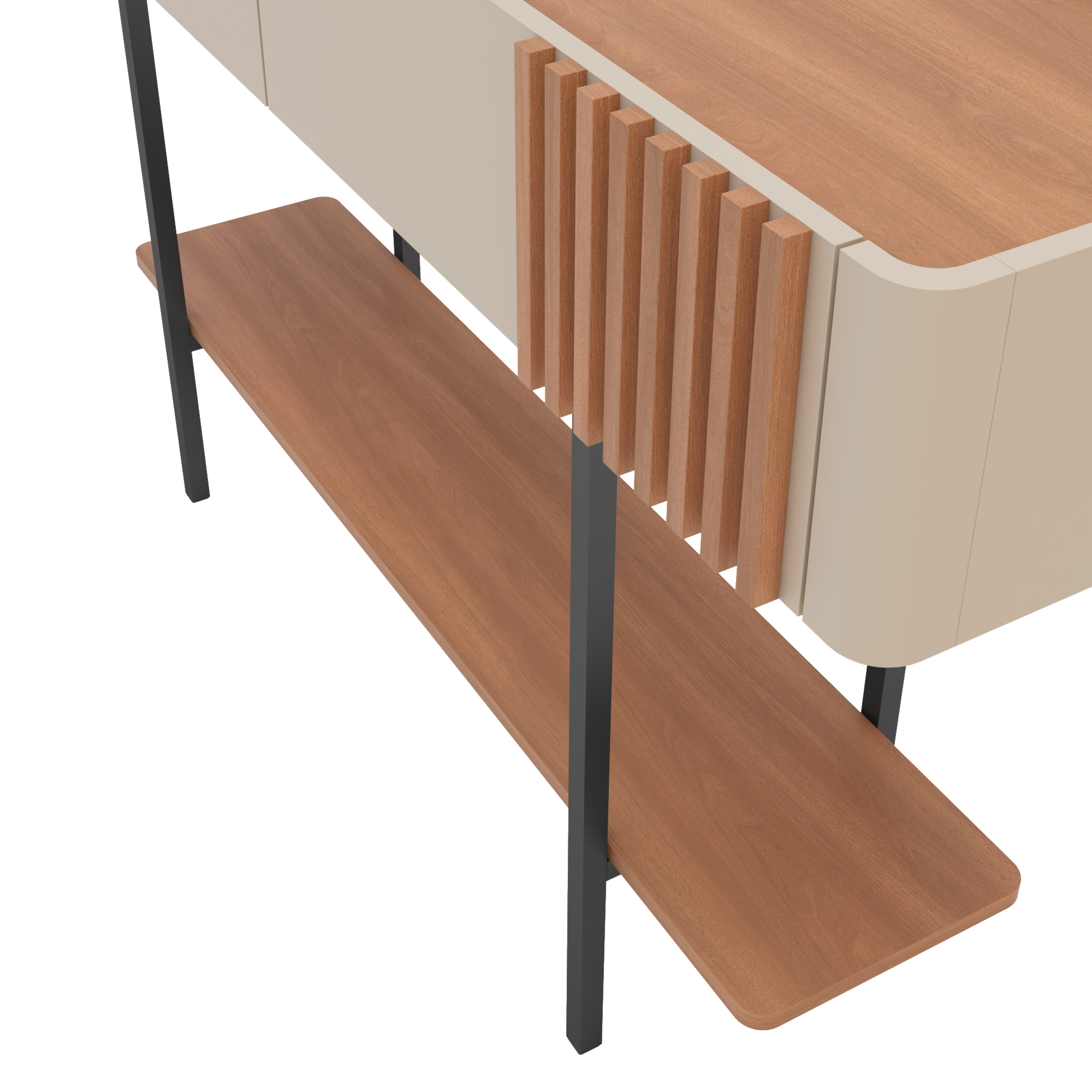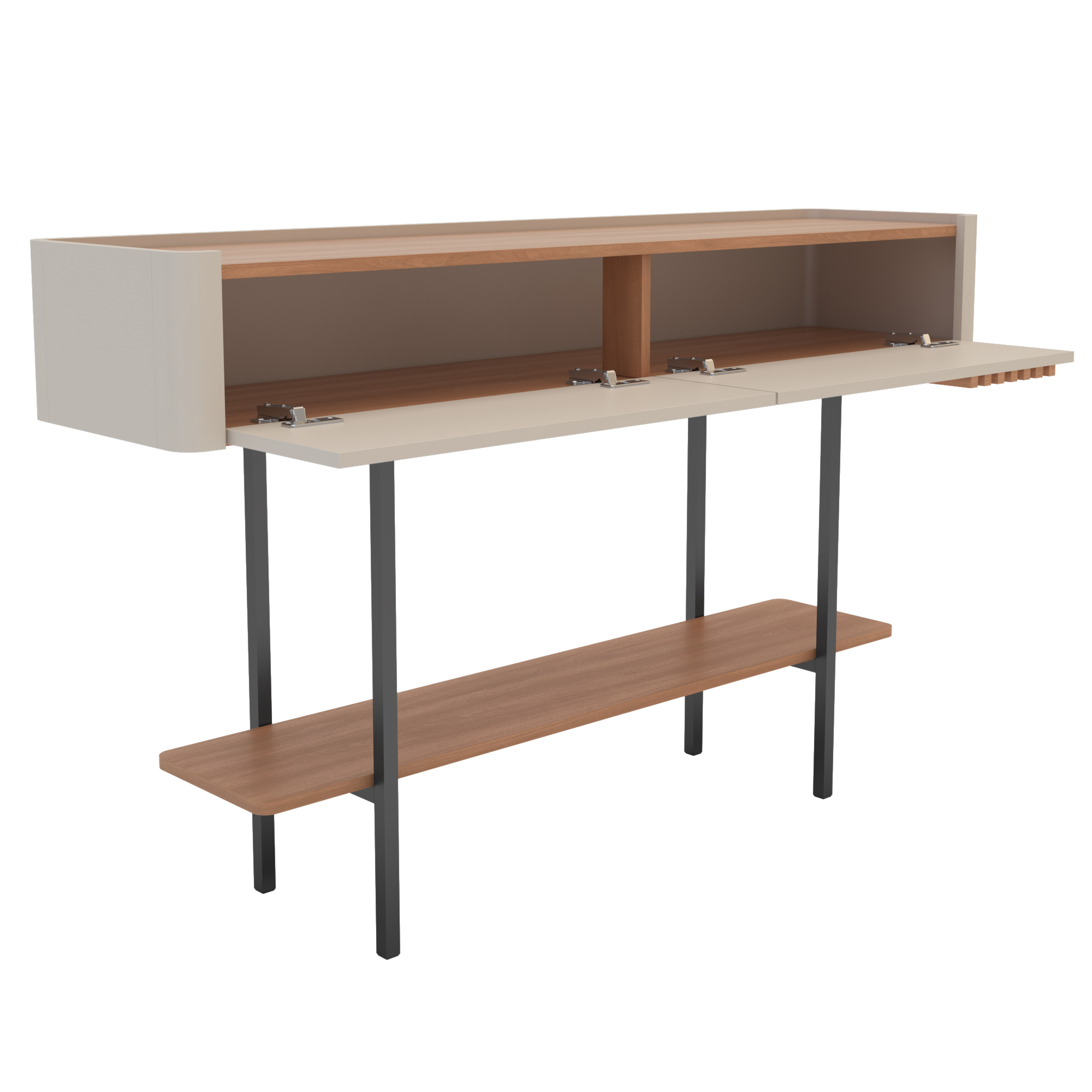 Aparador recibidor moderno, ideal para entradas o livings contemporáneos. Combina líneas minimalistas con detalles en madera natural, puertas de guardado y repisa inferior para decoración u objetos de uso diario. Incluye patas metálicas con capuchones protectores que evitan rayar el piso.