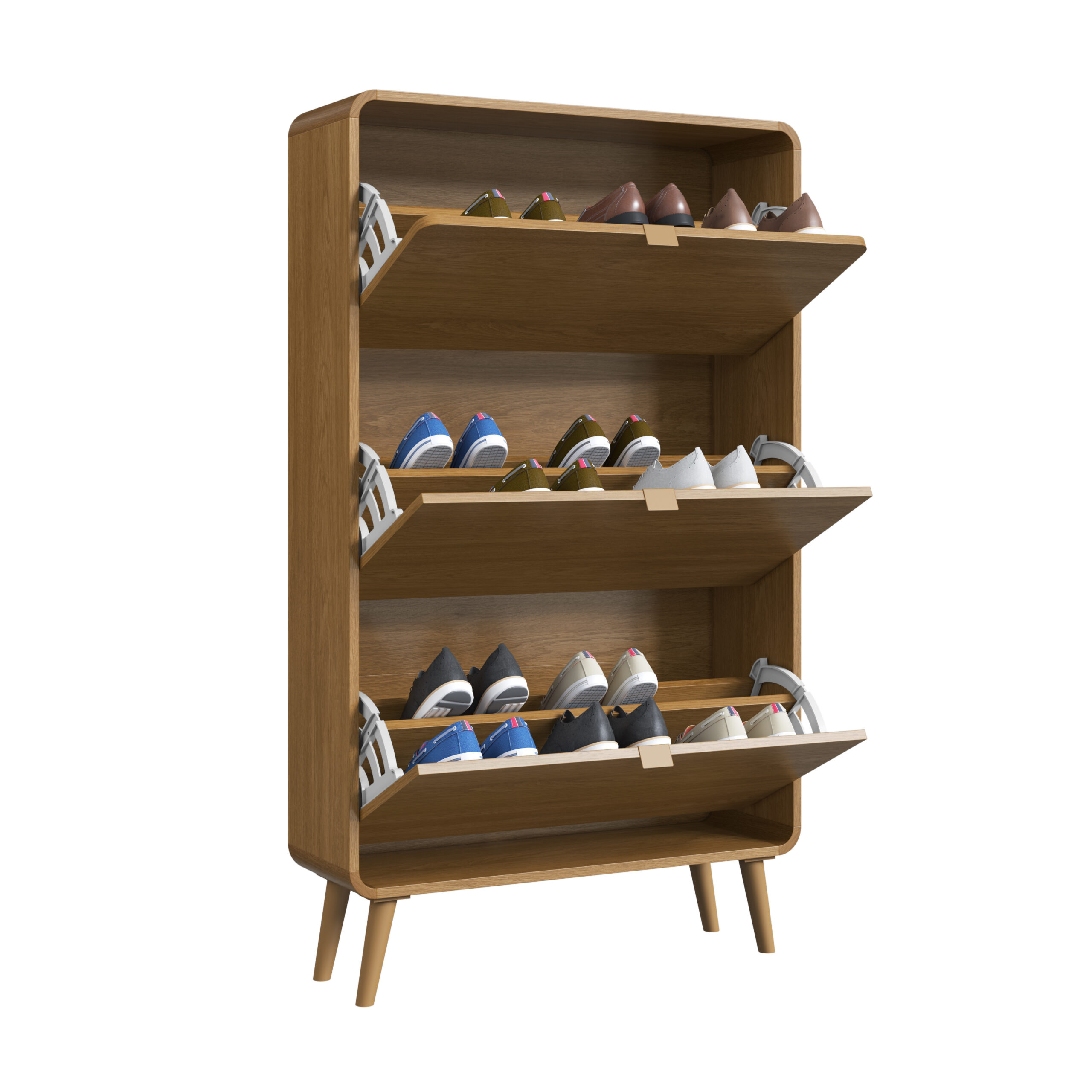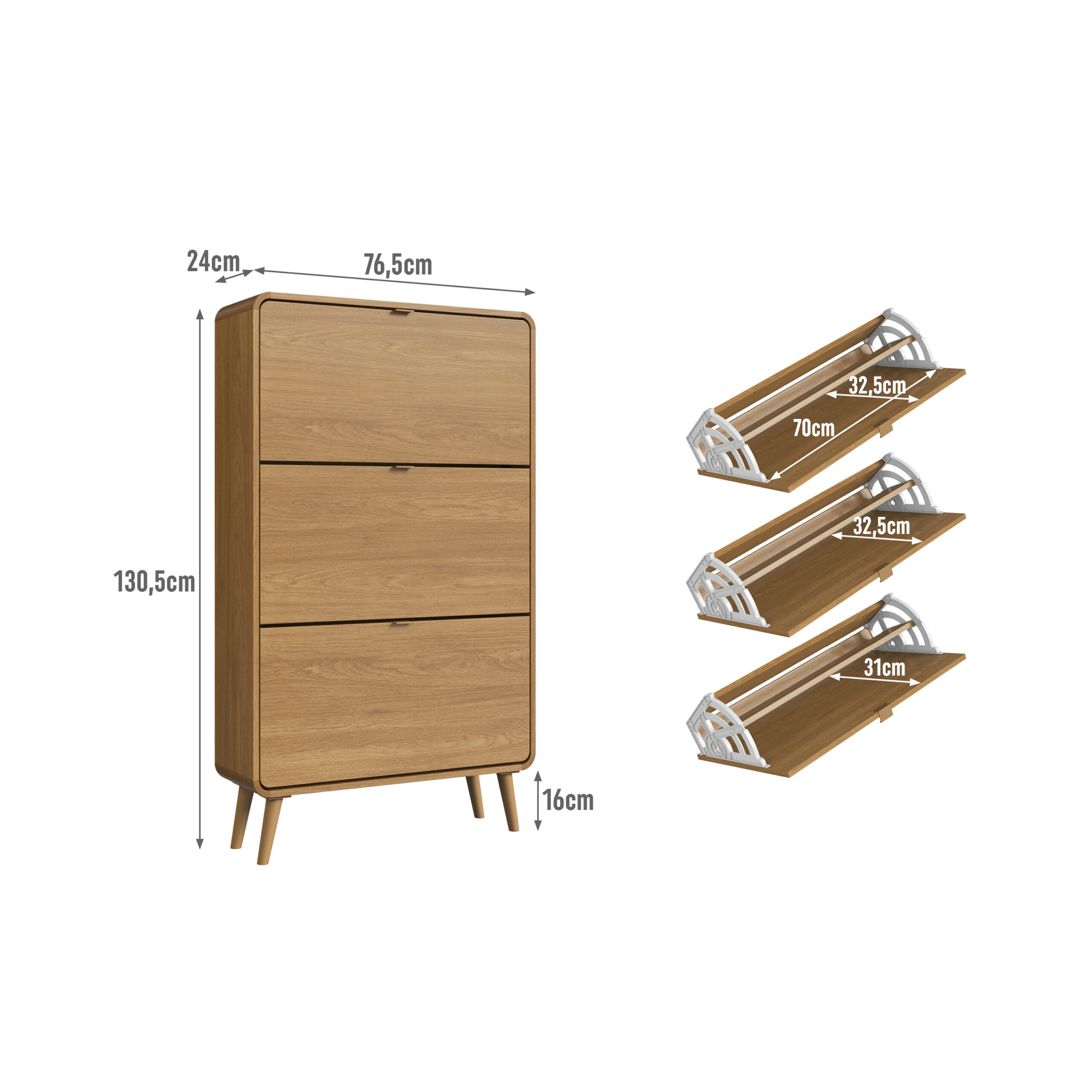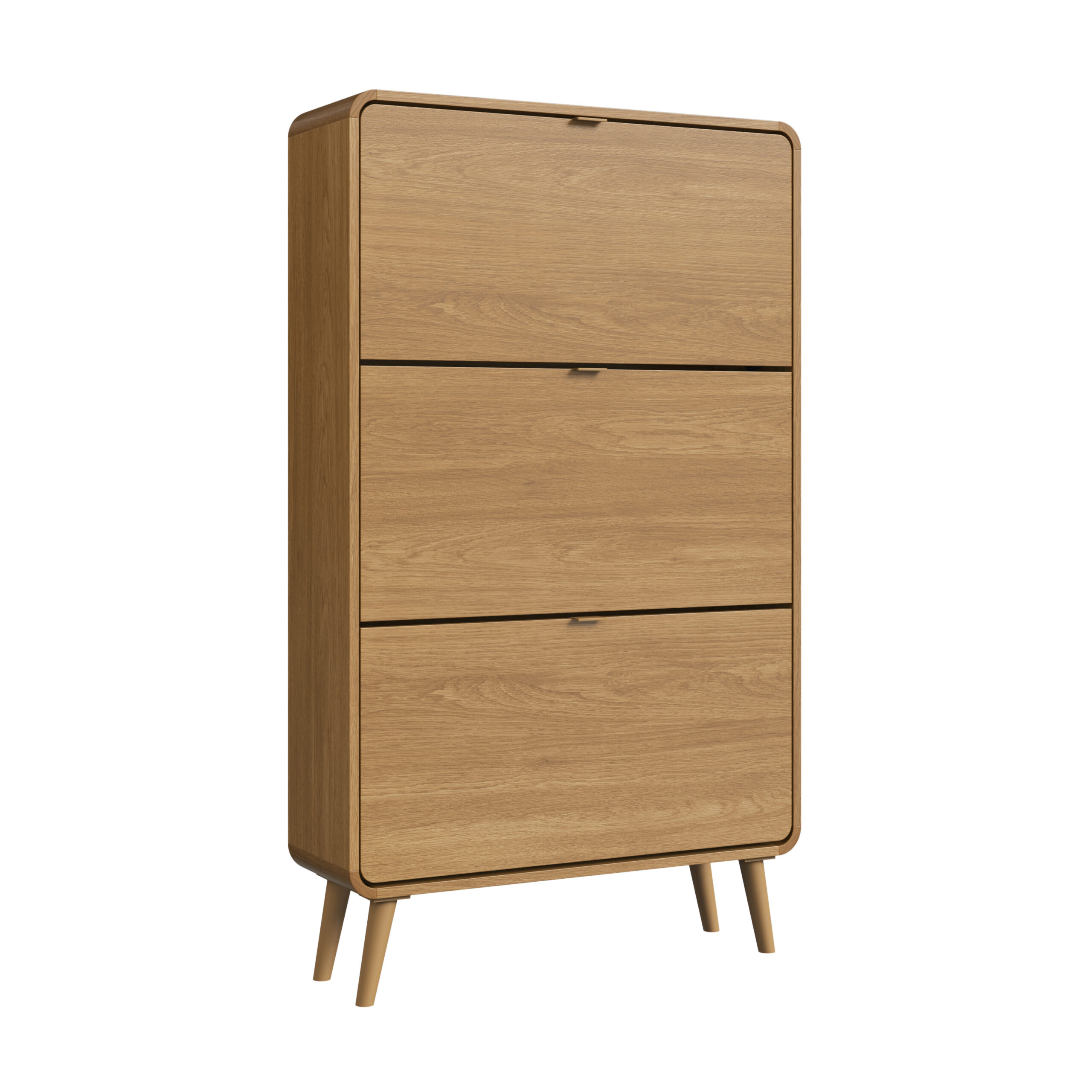Organiza con estilo gracias a esta moderna zapatera de diseño minimalista. Fabricada en MDP color roble, cuenta con tres compartimentos abatibles de gran capacidad que permiten almacenar tus zapatos de forma ordenada y discretamente. Sus patas elevadas aportan estabilidad y un toque cálido, facilitando además la limpieza del espacio.